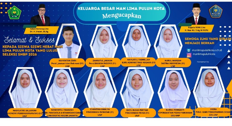 Humas MAN Lima Puluh Kota – Selasa, 31 Maret 2026 — Kabar membanggakan datang dari MAN Lima Puluh Kota. Sebanyak 10 orang siswa berhasil lulus Seleksi Nasional Berdasarkan Prestasi (SNBP) Tahun 2026 dan diterima di berbagai perguruan tinggi negeri terbaik di Indonesia. Keberhasilan ini menjadi bukti nyata dari kerja keras, ketekunan, serta doa yang senantiasa mengiringi langkah para siswa dalam meraih cita-cita. Keluarga besar MAN Lima Puluh Kota pun menyampaikan rasa bangga dan apresiasi setinggi-tingginya atas pencapaian gemilang tersebut. Adapun siswa-siswi yang berhasil lulus SNBP 2026 adalah: