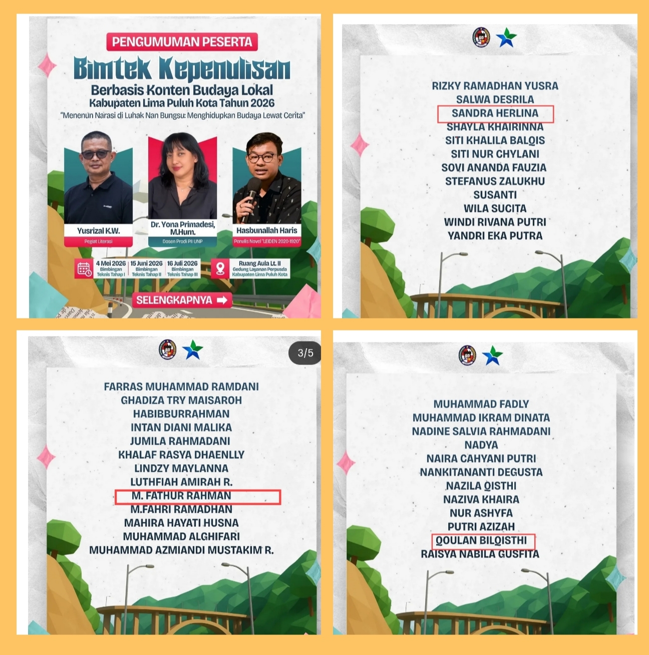 Alhamdulillah, dari seluruh peserta tingkat SMA/MA se-Kabupaten Lima Puluh Kota, tiga siswa MAN Lima Puluh Kota berhasil lolos dan menjadi bagian dari 50 peserta terpilih. Keberhasilan ini tidak terlepas dari bimbingan Ernawati, S.S., M.Pd., selaku pembina ekstrakurikuler Bengkel Sastra sekaligus guru Bahasa Indonesia di madrasah tersebut. Kegiatan ini menjadi wadah penting dalam meningkatkan literasi sekaligus menumbuhkan kecintaan generasi muda terhadap budaya lokal. Para peserta terpilih akan memperoleh berbagai fasilitas dari panitia, seperti alat tulis, uang pengganti transportasi, konsumsi dan kudapan selama kegiatan berlangsung, sertifikat, serta satu buku kumpulan karya yang memuat tulisan seluruh peserta.